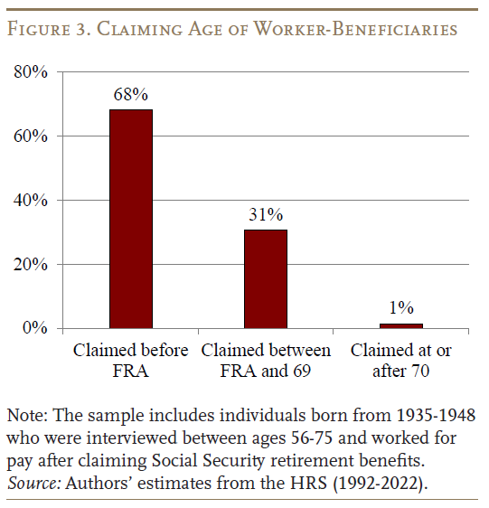 9. Yin, Chen, and Munnell (2023) examine earnings among Social Security beneficiaries. Ghilarducci (2024) shows that, in 2018, the majority of 65-year-old workers have claimed. A large literature shows the importance of earnings as a source of income for those ages 65+. For example, see Dushi et al. (2025). ↩︎