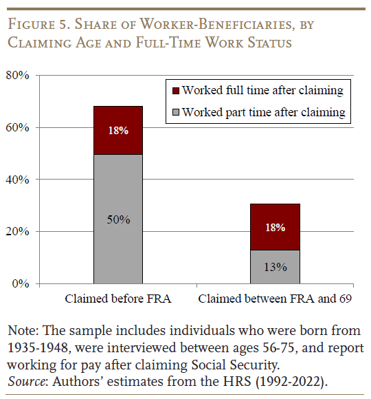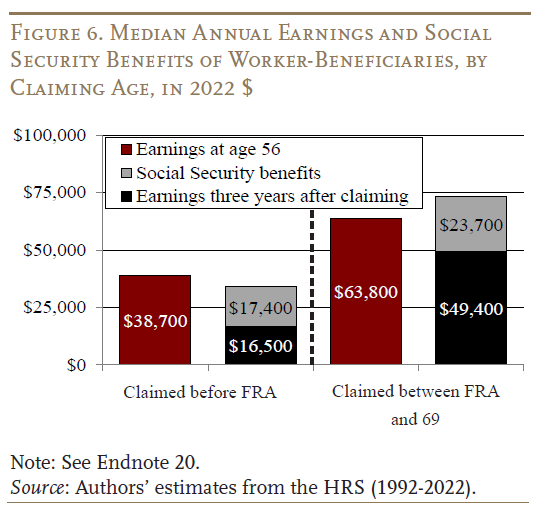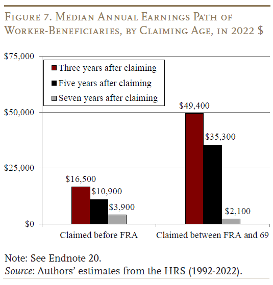 19. We examine earnings reported in the survey wave after individuals first report receiving Social Security benefits for a full calendar year to ensure that we are not simply capturing partial-year earnings for workers who claim and stop work immediately, or who claim benefits a few months prior to permanent retirement. ↩︎